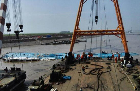 6月5日早上7時(shí)10分,現(xiàn)場(chǎng)救援人員正式對(duì)“東方之星”翻沉客輪實(shí)施扶正救助打撈方案。9時(shí)06分,高15米的“東方之星”號(hào)實(shí)現(xiàn)整體扶正。據(jù)現(xiàn)場(chǎng)救援隊(duì)伍稱,沉船水下雙利千斤頂穿引為扶正船體發(fā)揮了關(guān)鍵作用。