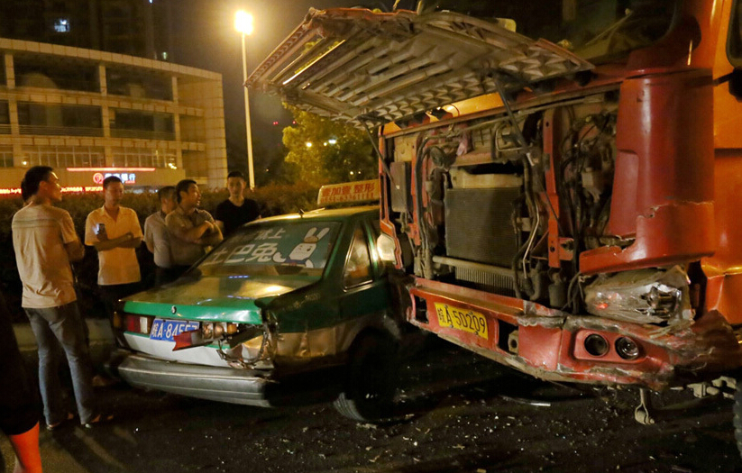 據報道,2015年9月13日晚上10點左右,安徽合肥,在習友路與懷寧路交口發(fā)生一起交通事故。一名被撞出租車的司機回憶,當時他駕駛車輛排隊停靠在十字路口轉彎區(qū)域,正準備由西向北左轉彎時,突然一輛渣土車由東向西迎面行駛而來,由于速度較快,將他的車和另外4輛車撞在一起,其中兩輛出租車被撞得一頭“扎”進綠化帶,被撞車輛出現不同程度損壞,但未造成人員傷亡。