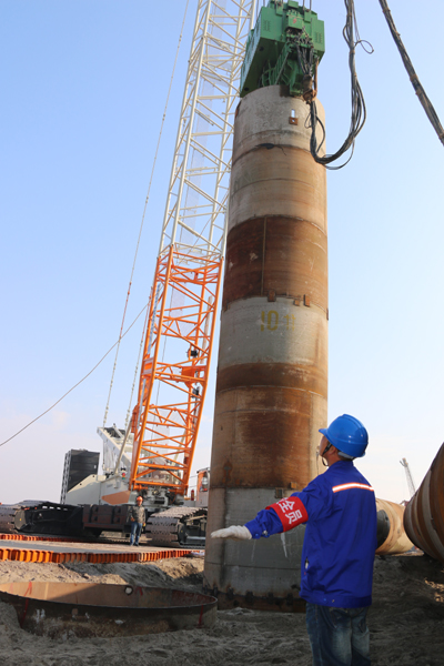 為確保首根樁鋼護筒順利插打到位,工作人員利用雙利千斤頂及時解決了施工中遇到的各種難題,確保了鋼護筒插打順利進行,為下一步鉆孔灌注樁施工的全面展開創(chuàng)造了有利條件。
