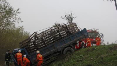 清晨司機(jī)疲勞駕駛翻車一人被困 液壓千斤頂施救援