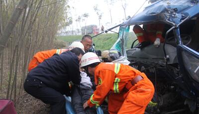 在救援現(xiàn)場(chǎng),消防官兵發(fā)現(xiàn)1輛小貨車沖出道路,一頭扎進(jìn)旁邊深溝。交警正在維持現(xiàn)場(chǎng)秩序,120醫(yī)務(wù)人員也在現(xiàn)場(chǎng)待命。經(jīng)現(xiàn)場(chǎng)偵查,一名大約30歲左右的男性被卡在駕駛室,他不時(shí)發(fā)出痛苦的呻吟?,F(xiàn)場(chǎng)指揮員命令:對(duì)變形的駕駛室進(jìn)行破拆,全力營(yíng)救男青年。